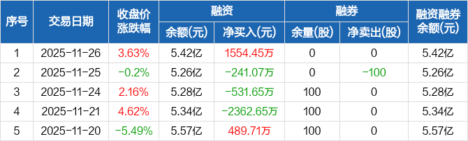 融资方面,当日融资买入7766.73万元,融资偿还6212.28万元,融资净买入1554.45万元。融券方面,融券卖出0股,融券偿还0股,融券余量0股,融券余额0元。融资融券余额合计5.42亿元。