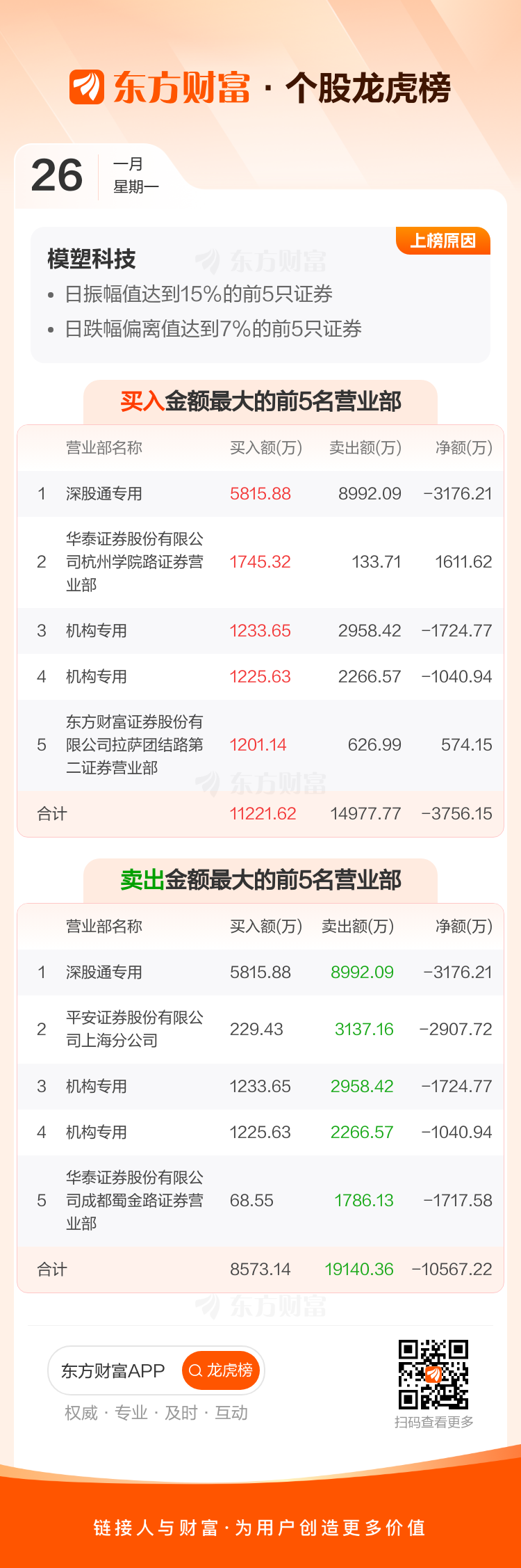 交易所2026年1月26日公布的交易公开信息显示,模塑科技因成为日振幅值达到15%的前5只证券、日跌幅偏离值达到7%的前5只证券上榜。模塑科技当日收报13.54元,涨跌幅-9.97%,偏离值15.58%,换手率10.56%,成交额13.66亿。