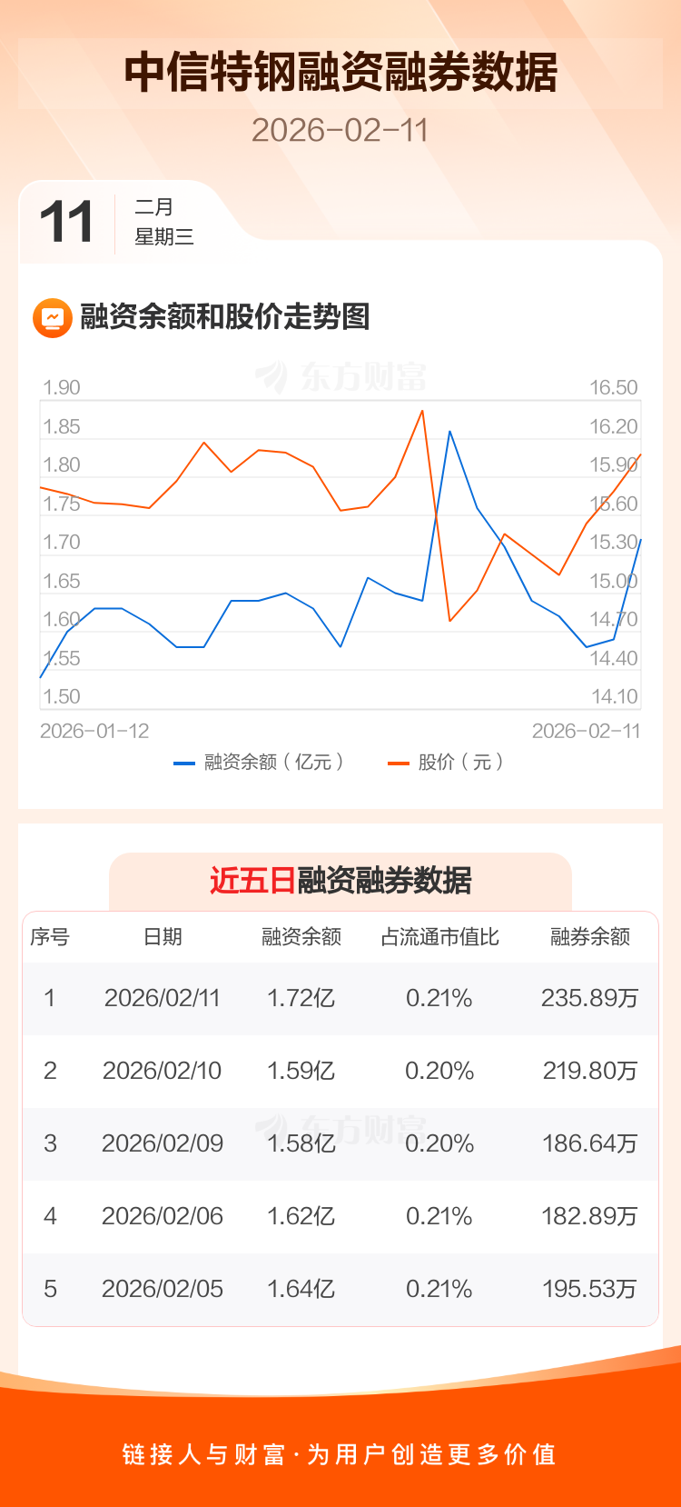 交易所最新数据显示,中信特钢于2026年2月11日获融资买入2415.69万元,融资偿还1083.72万元,当日融资净买入1331.97万元。目前,该股融资余额1.72亿,占流通市值比例为0.21%。