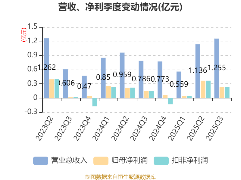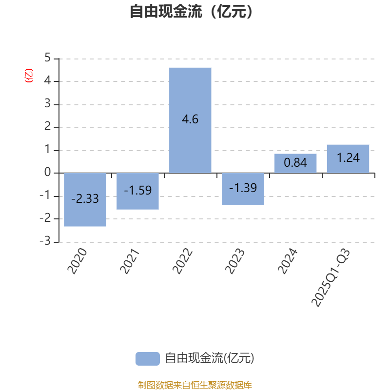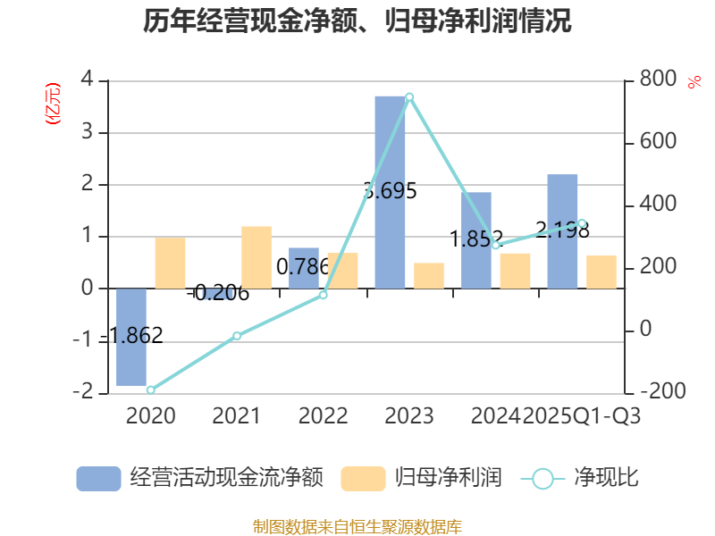 2025年前三季度,公司经营活动现金流净额为2.2亿元,同比增长51.78%;筹资活动现金流净额-496.18万元,同比减少1700.24万元;投资活动现金流净额-2.32亿元,上年同期为-4.02亿元。