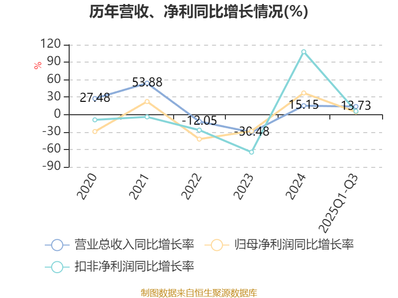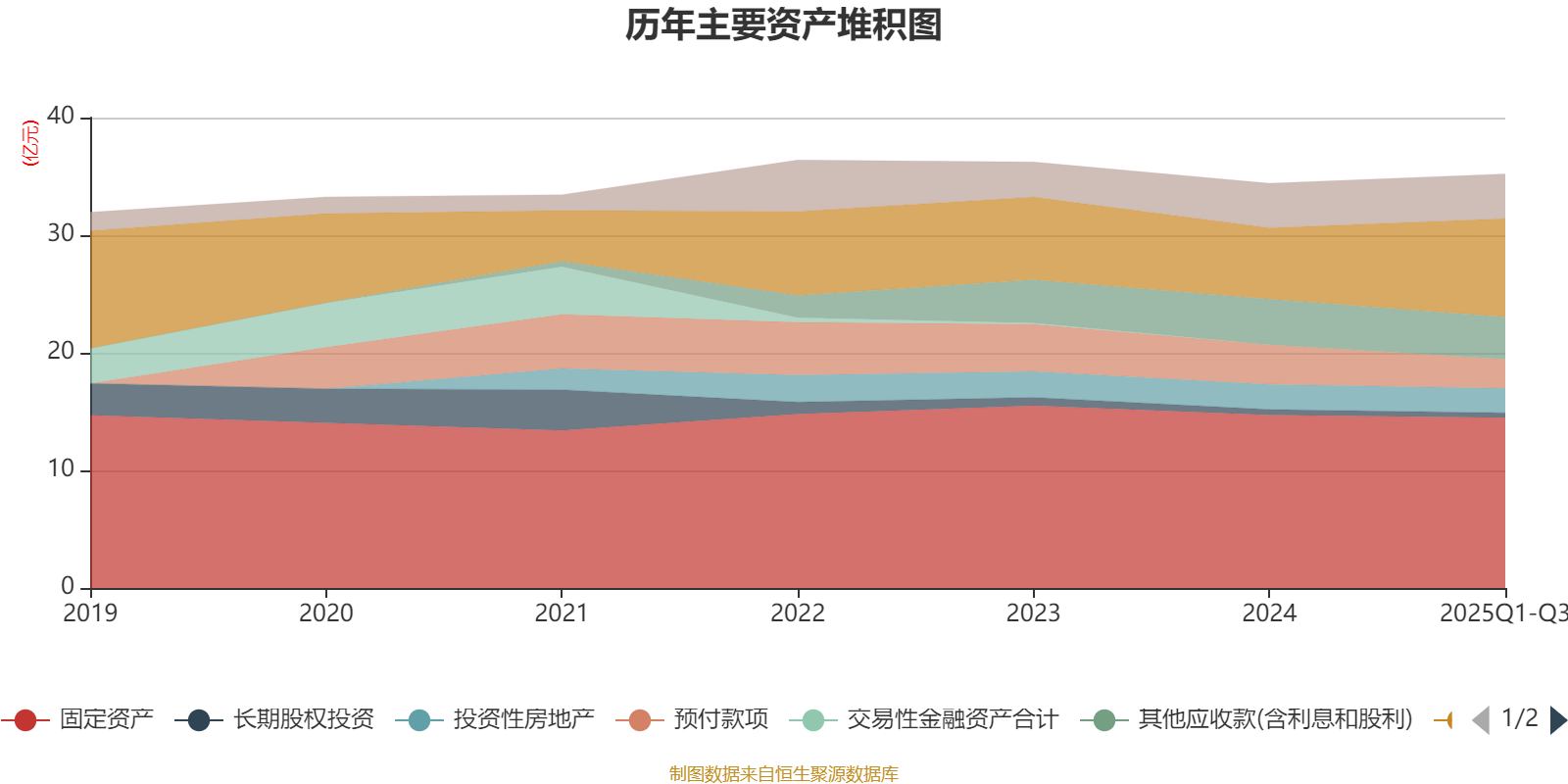 资产重大变化方面,截至2025年三季度末,公司货币资金较上年末增加37.89%,占公司总资产比重上升6.12个百分点;预付款项较上年末减少26.41%,占公司总资产比重下降2.76个百分点;固定资产较上年末减少1.63%,占公司总资产比重下降1.66个百分点;一年内到期的非流动资产较上年末减少100%,占公司总资产比重下降1.58个百分点。