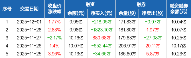 美锦能源:融资净偿还218.05万元,融资余额9.95亿元(12-01)