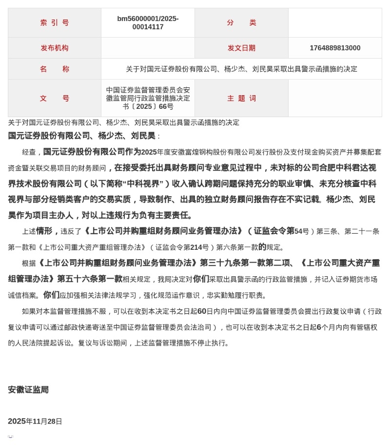针对以上问题,安徽证监局决定对国元证券股份有限公司、杨少杰、刘民昊采取出具警示函的行政监管措施,并记入证券期货市场诚信档案。