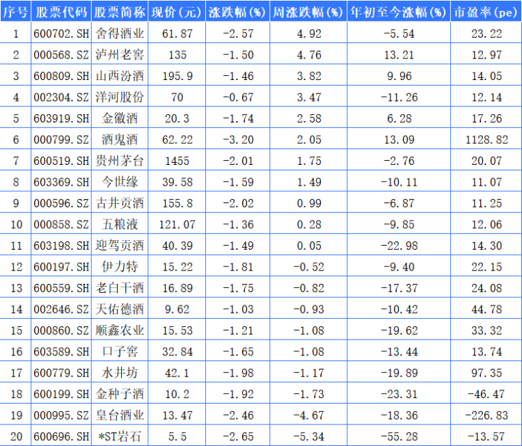 数据显示,11只白酒A股本周上涨,舍得酒业、泸州老窖、山西汾酒分别以4.92%、4.76%、3.82%,列白酒A股周涨幅前三。