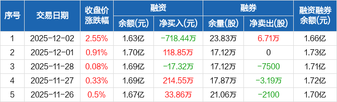 融资方面,当日融资买入1216.11万元,融资偿还1934.55万元,融资净偿还718.44万元。融券方面,融券卖出8.81万股,融券偿还2.1万股,融券余量23.83万股,融券余额297.16万元。融资融券余额合计1.66亿元。