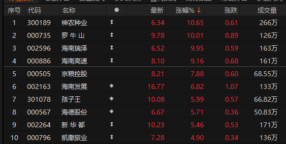 海南板块早盘异动走强,罗牛山(000735)、海南瑞泽(002596)涨停,神农种业涨超10%。