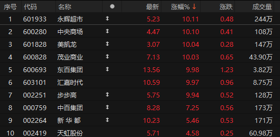 12月10日,零售板块盘中再度活跃,安记食品盘中一度涨停,走出7连板。截至午间休市,永辉超市、中央商场、美凯龙、东百集团等均涨停。东百集团、永辉超市分别斩获4连板和3连板。
