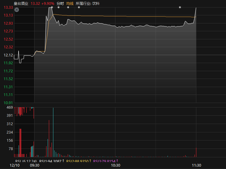 12月10日,白酒板块走高。开盘后不久,皇台酒业直线冲击涨停,在短暂封住涨停后股价震荡回落;临近午间休市,皇台酒业再度直线拉升冲击涨停,截至11:30,股价报13.32元/股,距离涨停仅差1分钱。