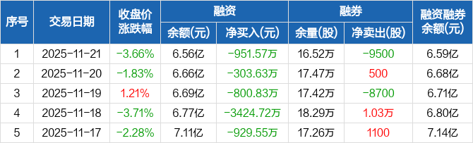 北方铜业融资融券信息显示,2025年11月21日融资净偿还951.57万元;融资余额6.56亿元,较前一日下降1.43%。