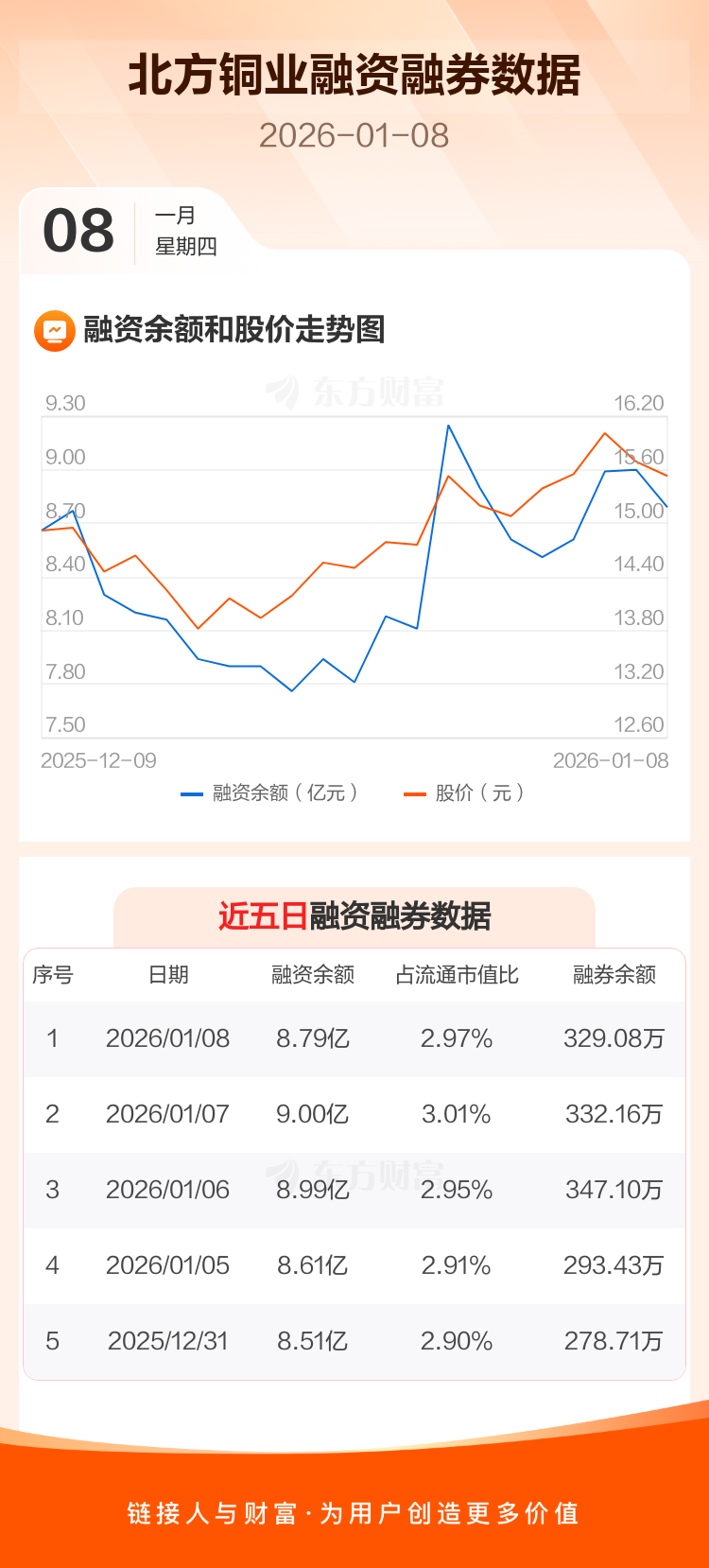 交易所最新数据显示,北方铜业于2026年1月8日获融资买入1.34亿元,融资偿还1.55亿元,当日融资净偿还2130.28万元。目前,该股融资余额8.79亿,占流通市值比例为2.97%。