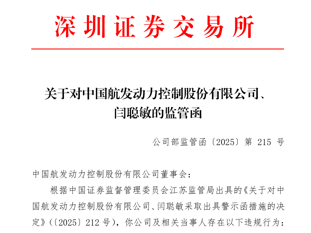 与此同时,因上述事项,深交所于12日向航发控制、闫聪敏下发监管函。