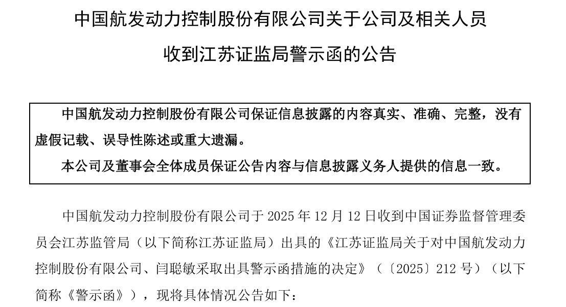 12月12日盘后,航发控制(000738)公告称,公司及相关人员收到江苏证监局警示函。