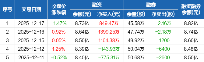 融资方面,当日融资买入5853.98万元,融资偿还5004.51万元,融资净买入849.47万元,连续3日净买入累计3413.1万元。融券方面,融券卖出4.4万股,融券偿还6.56万股,融券余量45.58万股,融券余额884.71万元。融资融券余额合计8.82亿元。