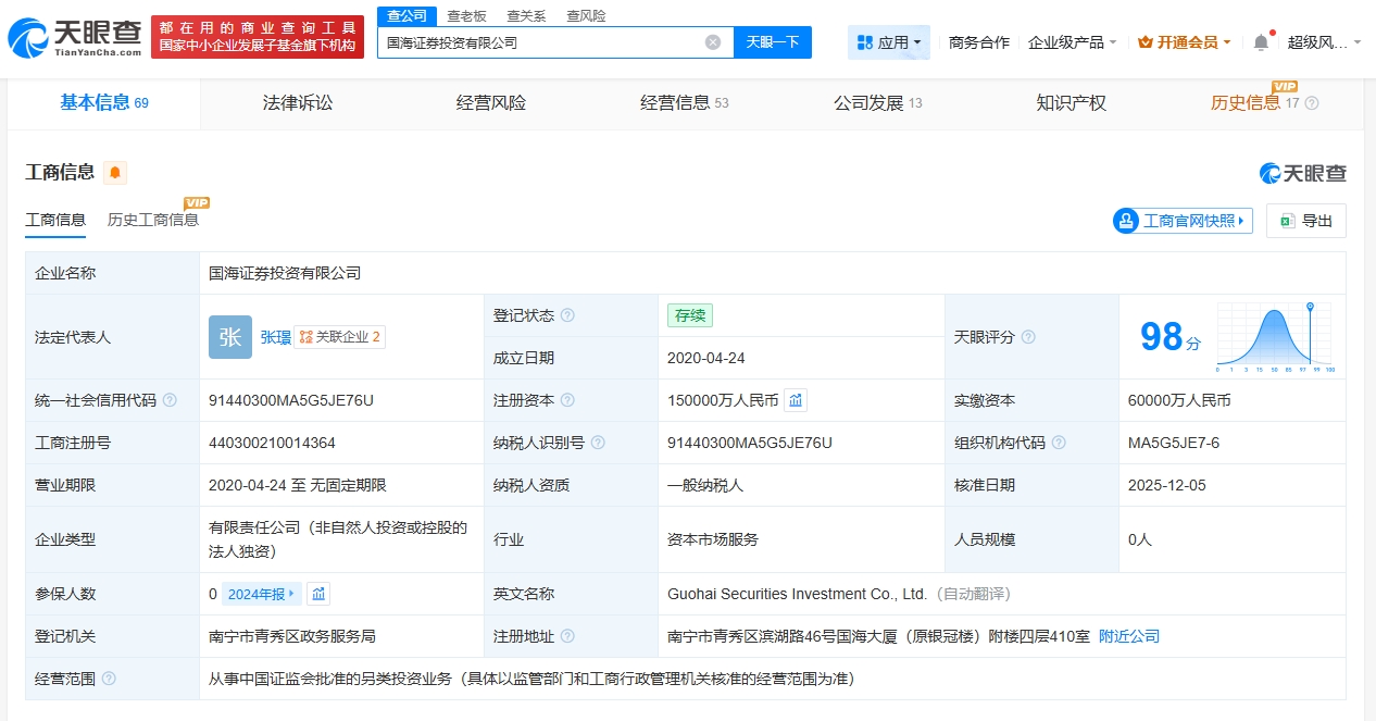南方财经12月11日电,天眼查工商信息显示,近日,国海证券投资有限公司发生工商变更,注册资本由10亿人民币增至15亿人民币,增幅50%,同时部分高管发生变更。该公司成立于2020年4月,法定代表人为张璟,经营范围包括从事中国证监会批准的另类投资业务。股东信息显示,该公司由国海证券(000750)全资持股。
