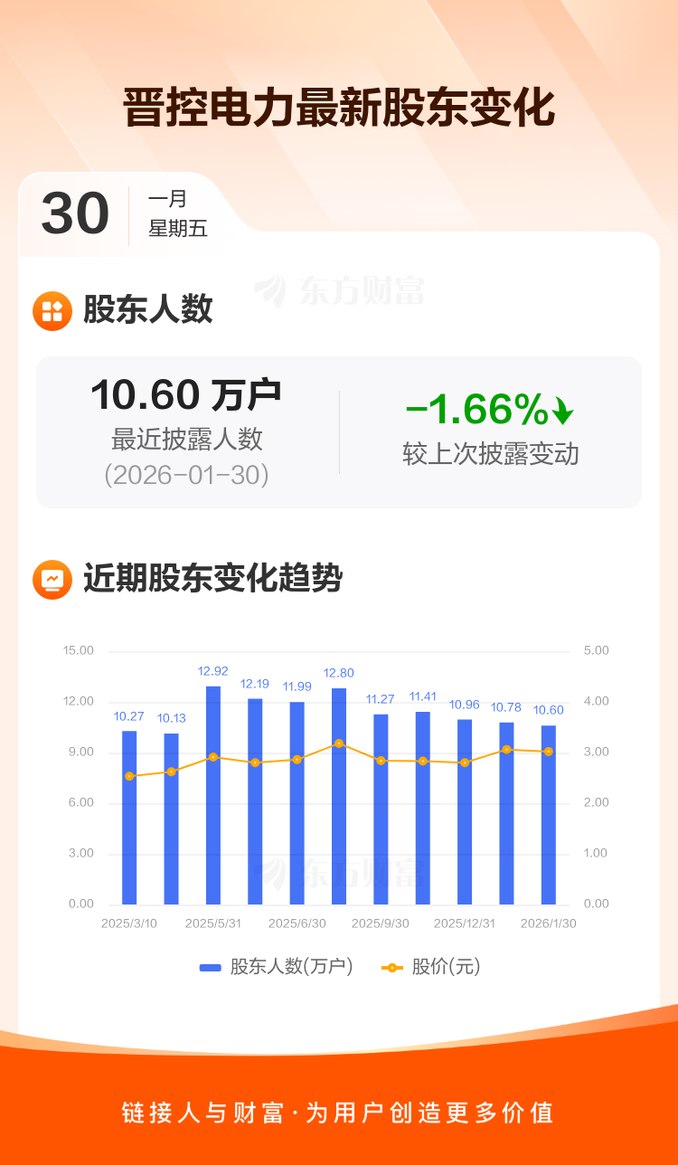 晋控电力:截至1月30日最新股东户数10.60万户,较上期减少1.66%