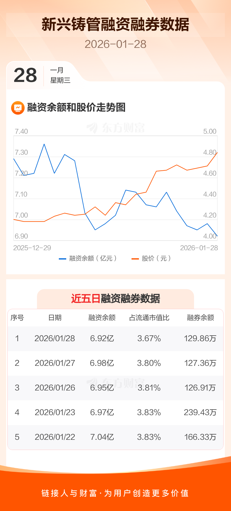 交易所最新数据显示,新兴铸管于2026年1月28日获融资买入4957.70万元,融资偿还5556.29万元,当日融资净偿还598.58万元。目前,该股融资余额6.92亿,占流通市值比例为3.67%。