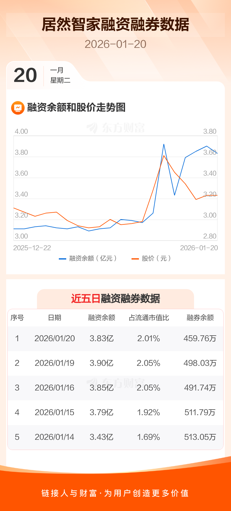 交易所最新数据显示,居然智家于2026年1月20日获融资买入3001.83万元,融资偿还3629.89万元,当日融资净偿还628.06万元。目前,该股融资余额3.83亿,占流通市值比例为2.01%。