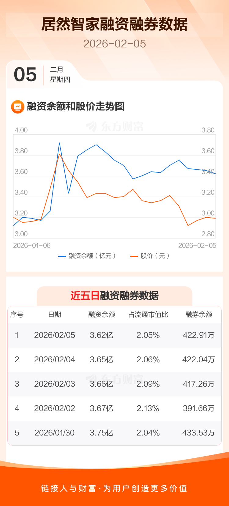 交易所最新数据显示,居然智家于2026年2月5日获融资买入1355.63万元,融资偿还1674.76万元,当日融资净偿还319.13万元。目前,该股融资余额3.62亿,占流通市值比例为2.05%。