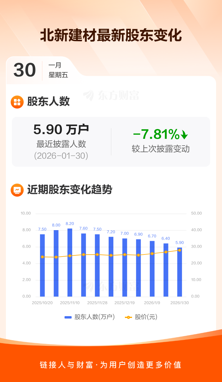 北新建材最新披露数据显示,截至1月30日公司股东户数为5.90万户,较上期(2026年1月20日)减少5000户,降幅为7.81%。户均持有流通股数量由上期的2.64万股上升至2.86万股,户均持股金额由上期的70.80万元增加至79.89万元。