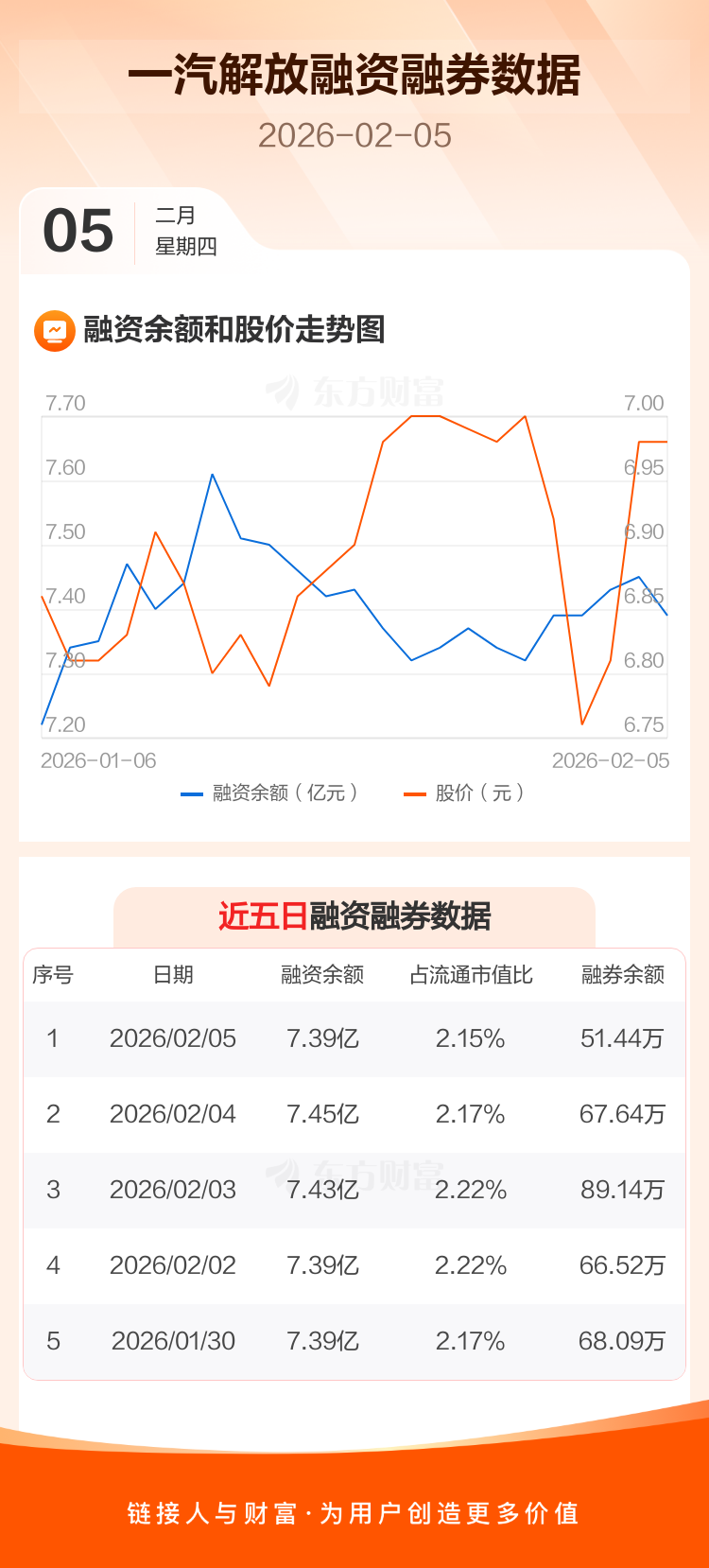 交易所最新数据显示,一汽解放于2026年2月5日获融资买入690.88万元,融资偿还1264.71万元,当日融资净偿还573.83万元。目前,该股融资余额7.39亿,占流通市值比例为2.15%。