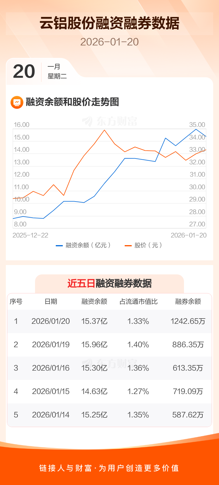 交易所最新数据显示,云铝股份于2026年1月20日获融资买入1.68亿元,融资偿还2.28亿元,当日融资净偿还5914.2万元。目前,该股融资余额15.37亿,占流通市值比例为1.33%。