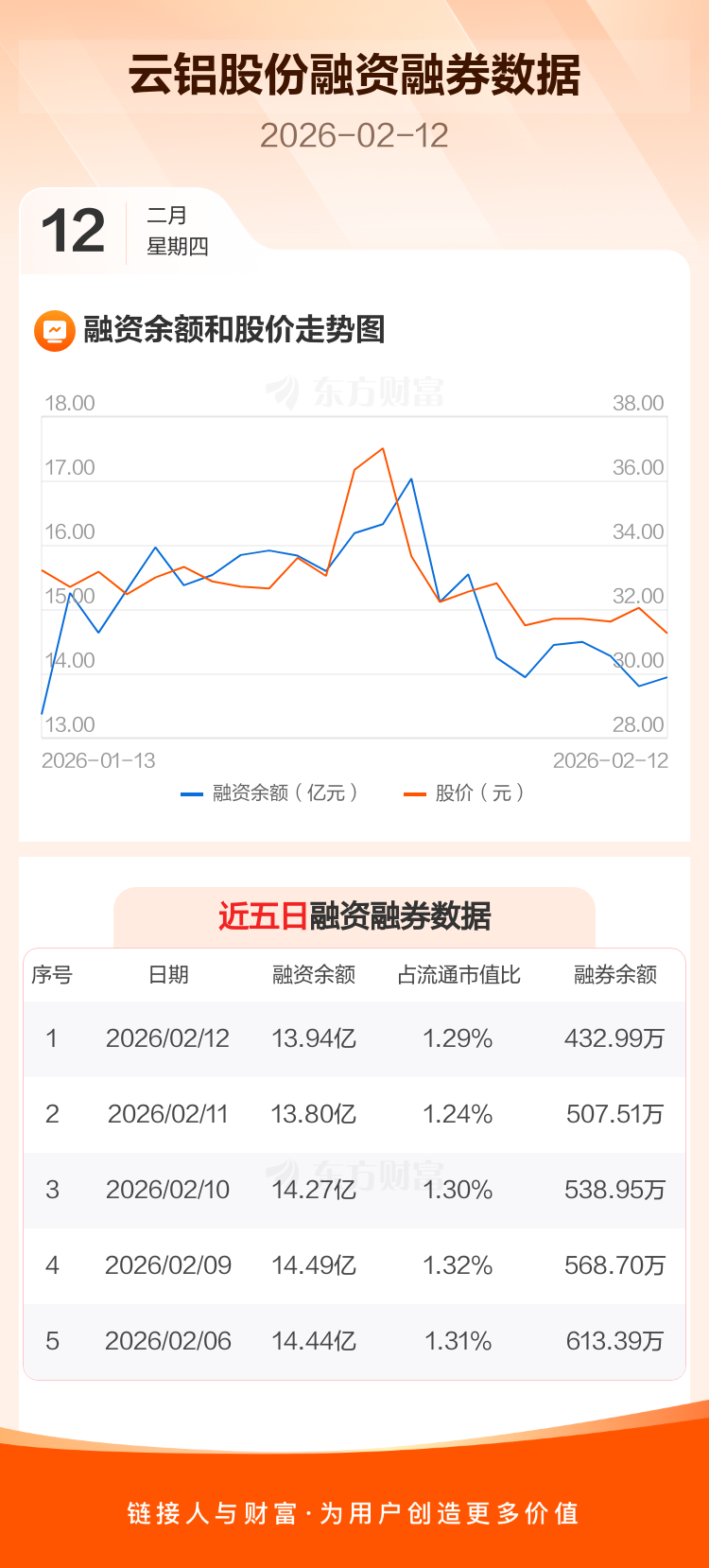 交易所最新数据显示,云铝股份于2026年2月12日获融资买入1.13亿元,融资偿还9842.34万元,当日融资净买入1454.4万元。目前,该股融资余额13.94亿,占流通市值比例为1.29%。