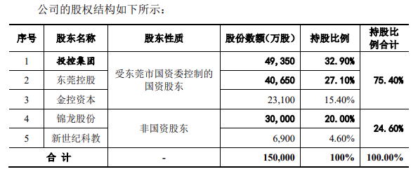 具体来看,东莞控股与金控集团此前以22.72亿元收购了锦龙股份持有的东莞证券20%的股权,使其合计持股比例提升至75.40%,东莞市国资委通过投控集团、东莞控股、金控资本间接控制东莞证券75.40%的股份,成为实际控制人。非国资股东锦龙股份和新世纪科教作为一致行动人,共同持有东莞证券24.60%的股份,其中原第一大股东锦龙股份持股比例从40%下降至20%。