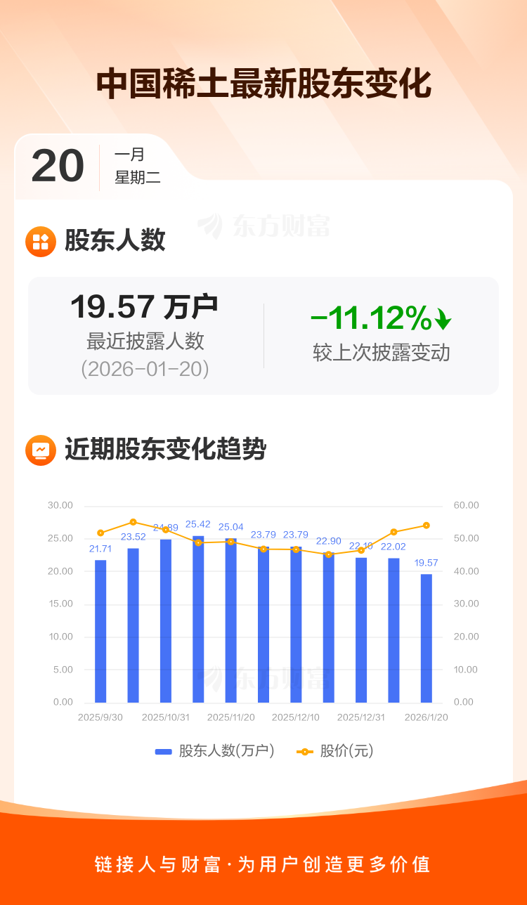 中国稀土:截至1月20日最新股东户数19.57万户,较上期减少11.12%