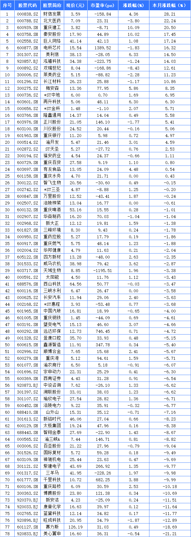 领涨的股票中,财信发展、北大医药、重庆建工分别以涨幅28.21%、22.24%和20.50%,位列重庆A股本月涨幅前三强。