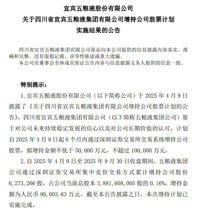 五粮液:五粮液集团增持计划实施完成,累计增持627.33万股公司股份