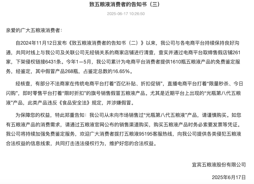 五粮液表示, 经核查,有部分不法商家在传统电商平台打着“百亿补贴、折扣促销”口号,直播电商平台打着“限量秒杀、今日闪购”口号,即时零售平台打着“限时折扣”的口号销售假冒五粮液产品。尤其是近期平台上出现的“光瓶第八代五粮液”产品,此类产品违反《食品安全法》规定,并涉嫌假冒。