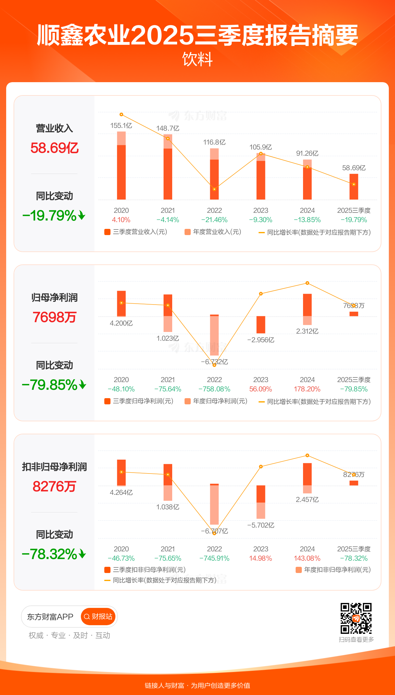 顺鑫农业10月30日发布2025年三季报显示,公司前三季实现营业收入58.69亿元,同比下滑19.79%;归母净利润7698.28万元,同比下滑79.85%;扣非归母净利润8275.56万元,同比下滑78.32%。