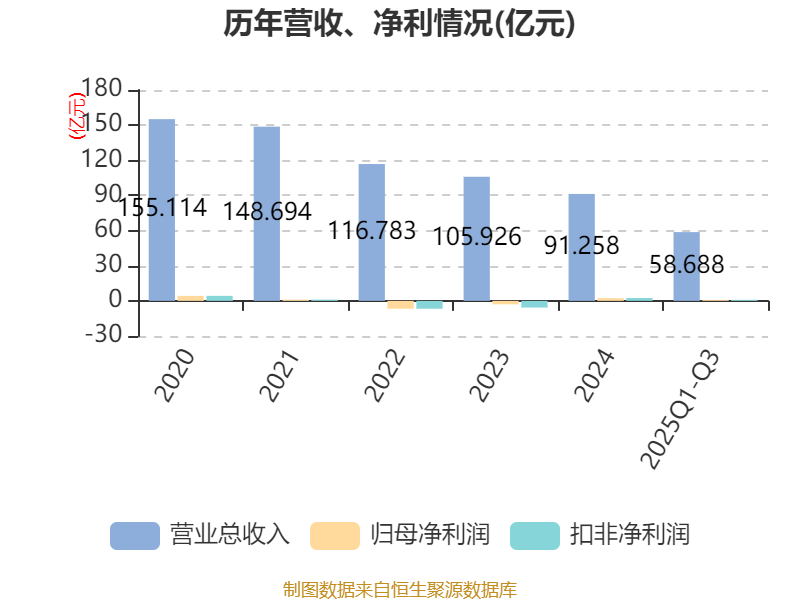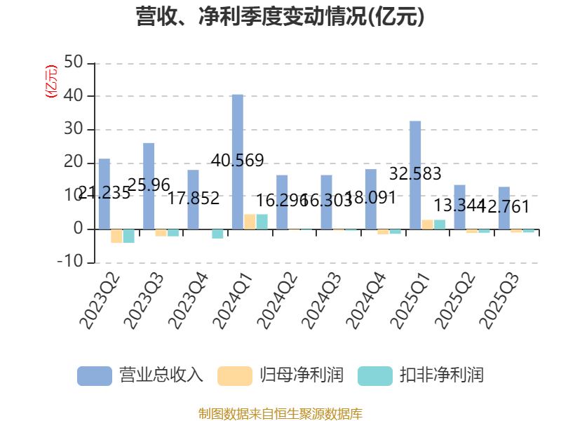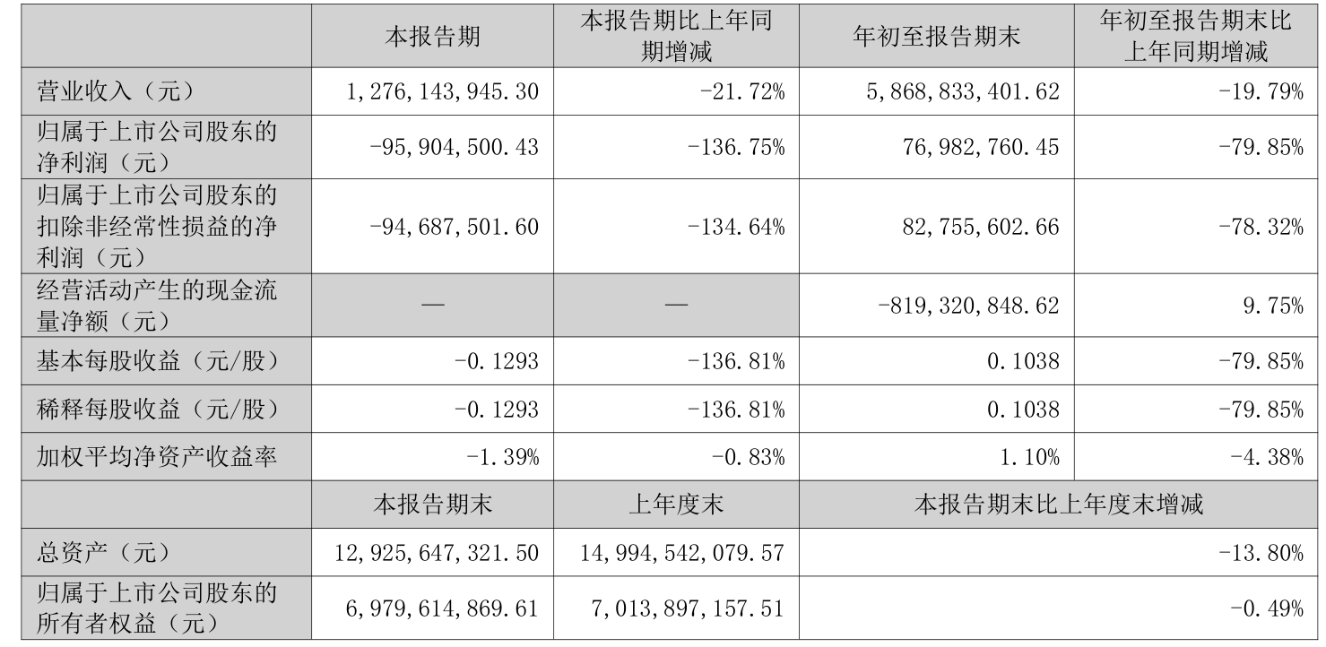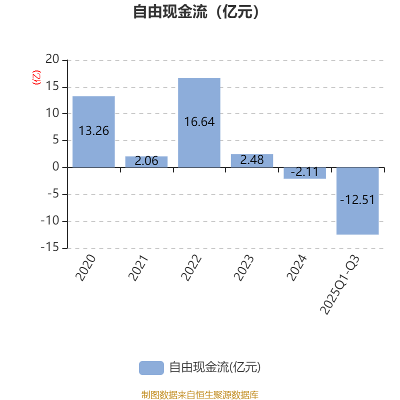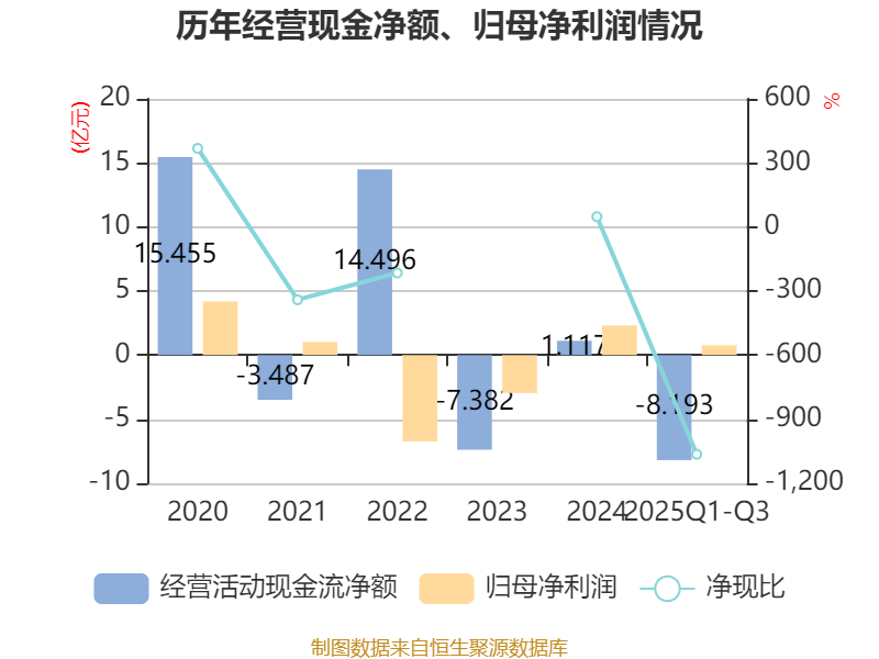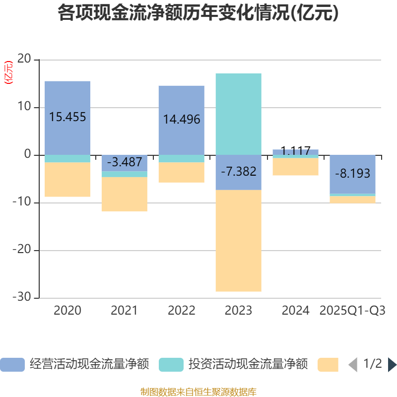 2025年前三季度,公司经营活动现金流净额为-8.19亿元,同比增加8853.1万元;筹资活动现金流净额-1.47亿元,同比减少1.48亿元;投资活动现金流净额-5004.93万元,上年同期为-5626.64万元。
