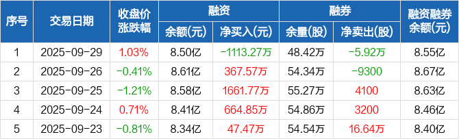 新希望:融资净偿还1113.27万元,融资余额8.5亿元(09-29)
