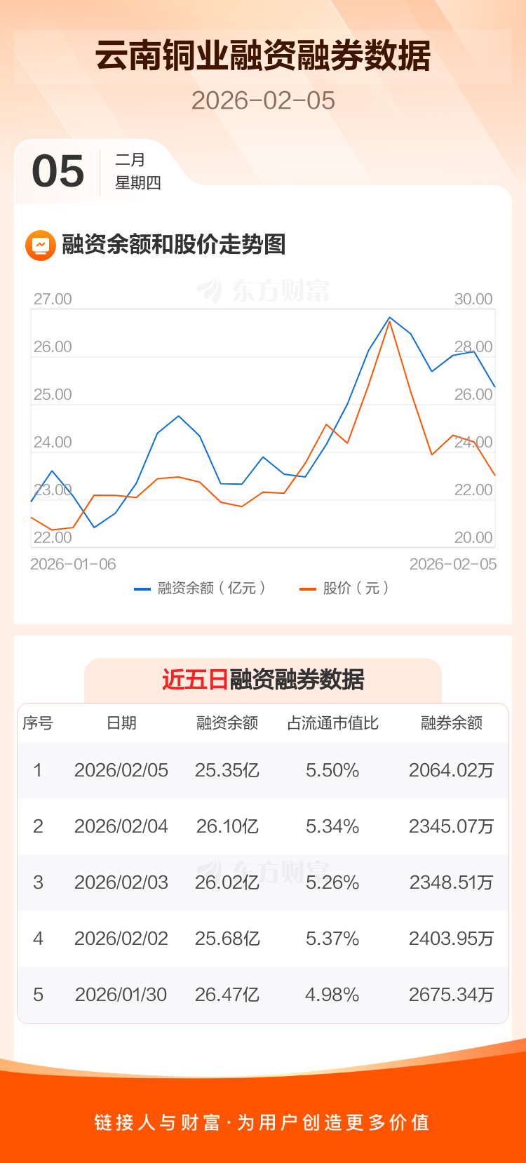 交易所最新数据显示,云南铜业于2026年2月5日获融资买入1.93亿元,融资偿还2.67亿元,当日融资净偿还7466.93万元。目前,该股融资余额25.35亿,占流通市值比例为5.50%。