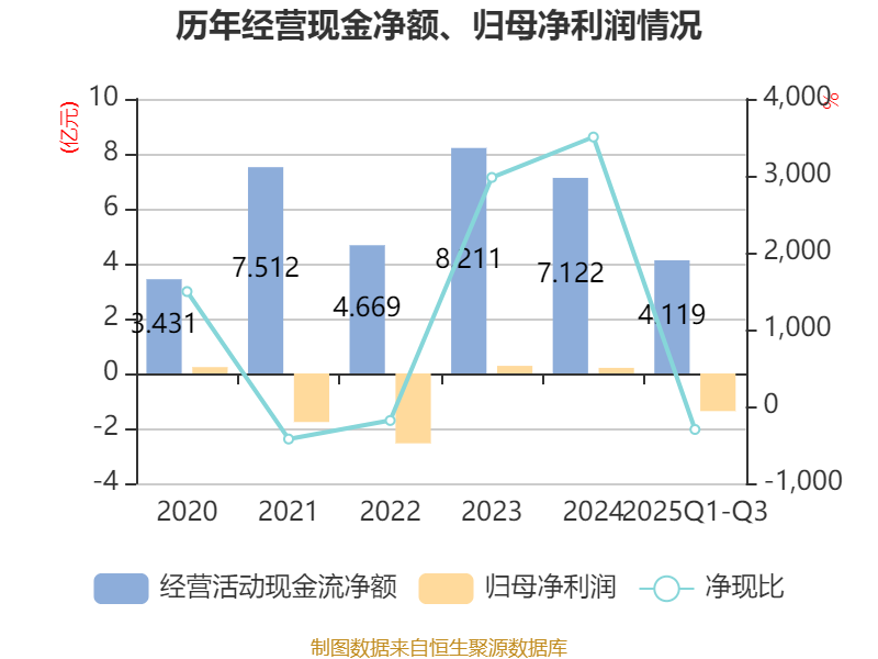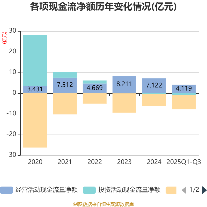 2025年前三季度,公司经营活动现金流净额为4.12亿元,同比下降38.16%;筹资活动现金流净额-6.9亿元,同比减少6.1亿元;投资活动现金流净额-8729.37万元,上年同期为-5.51亿元。