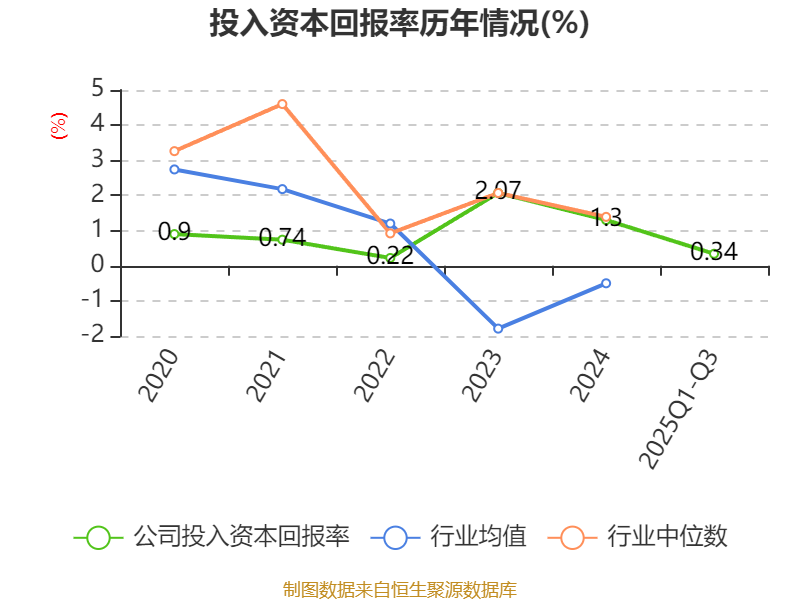盈利能力方面, 2025年前三季度公司加权平均净资产收益率为-2.01%,同比下降2.42个百分点。公司2025年前三季度投入资本回报率为0.34%,较上年同期下降1.21个百分点。