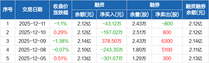 城发环境:融资净偿还43.12万元,融资余额2.12亿元(12-11)