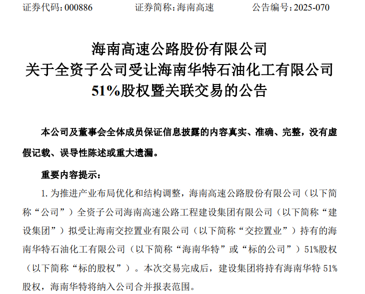 前三季亏损超千万元,海南高速子公司拟受让海南华特51%股权