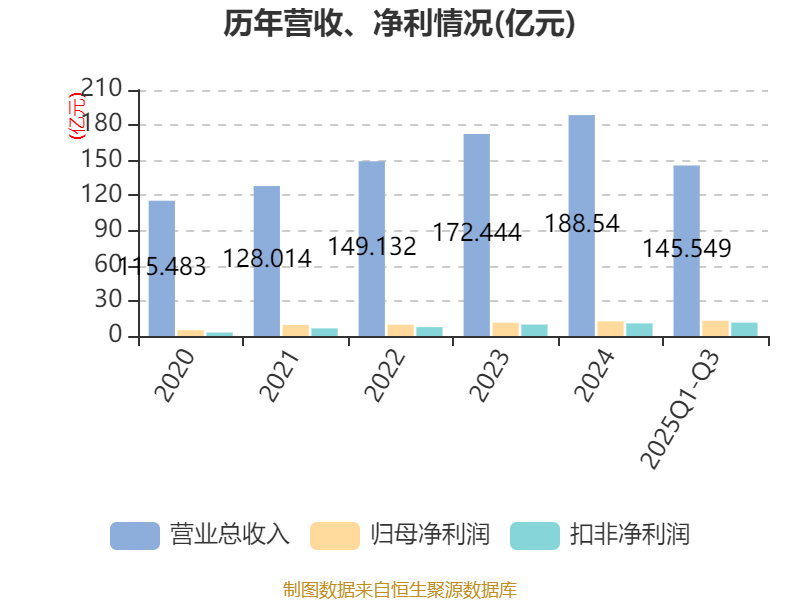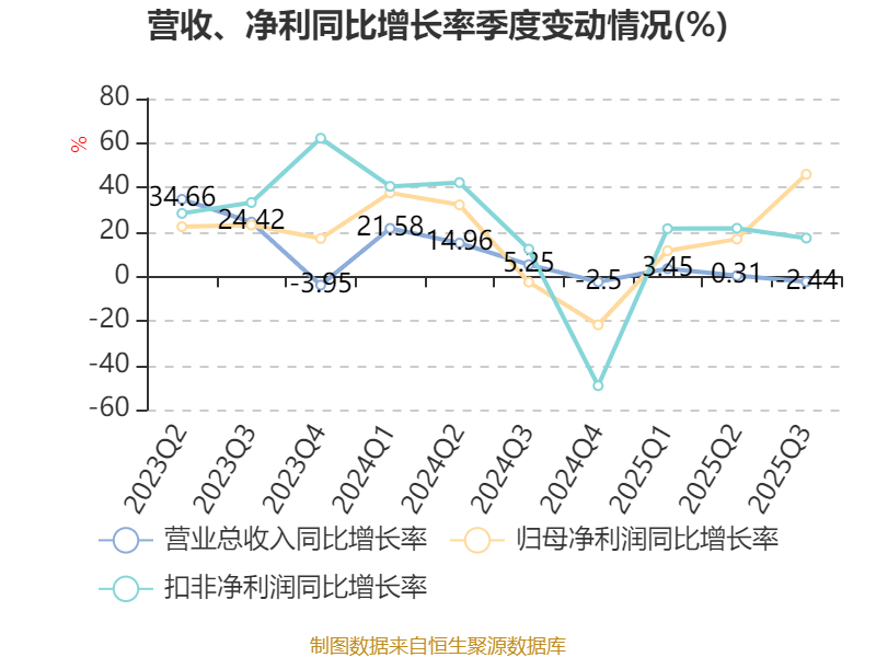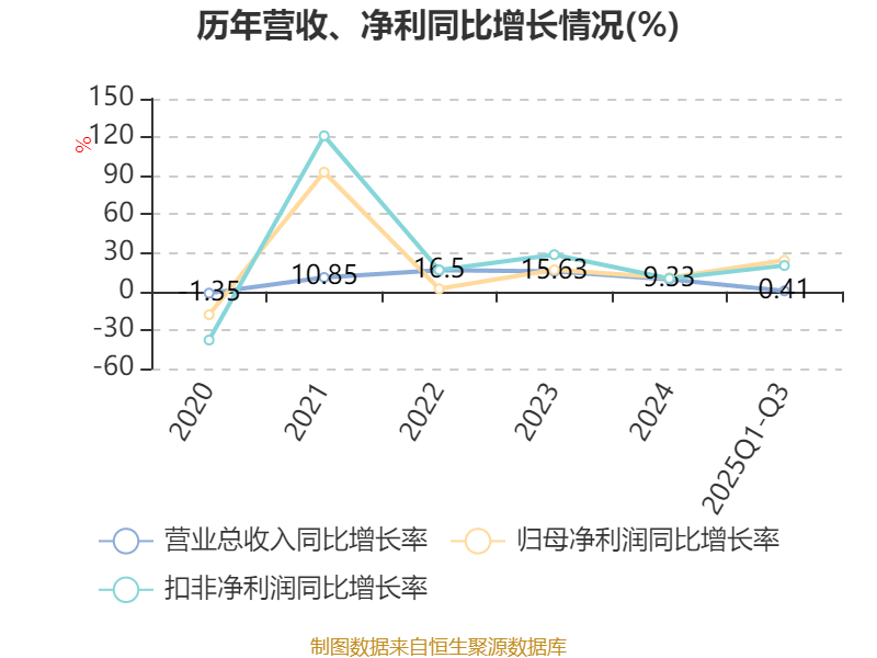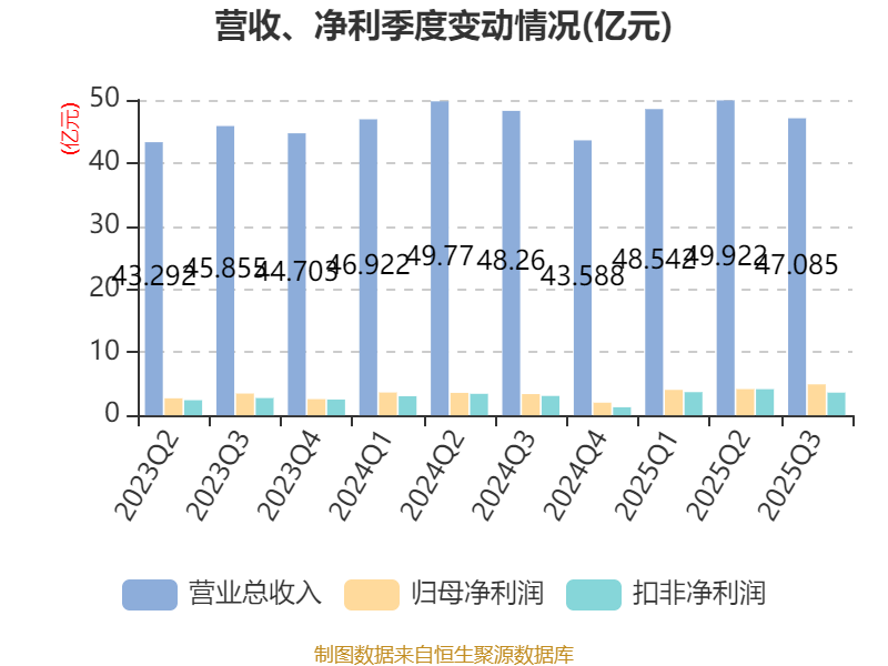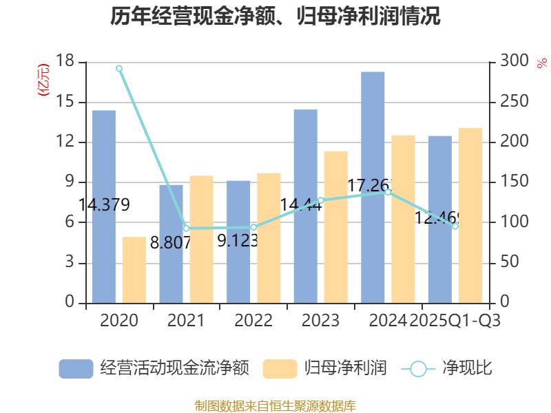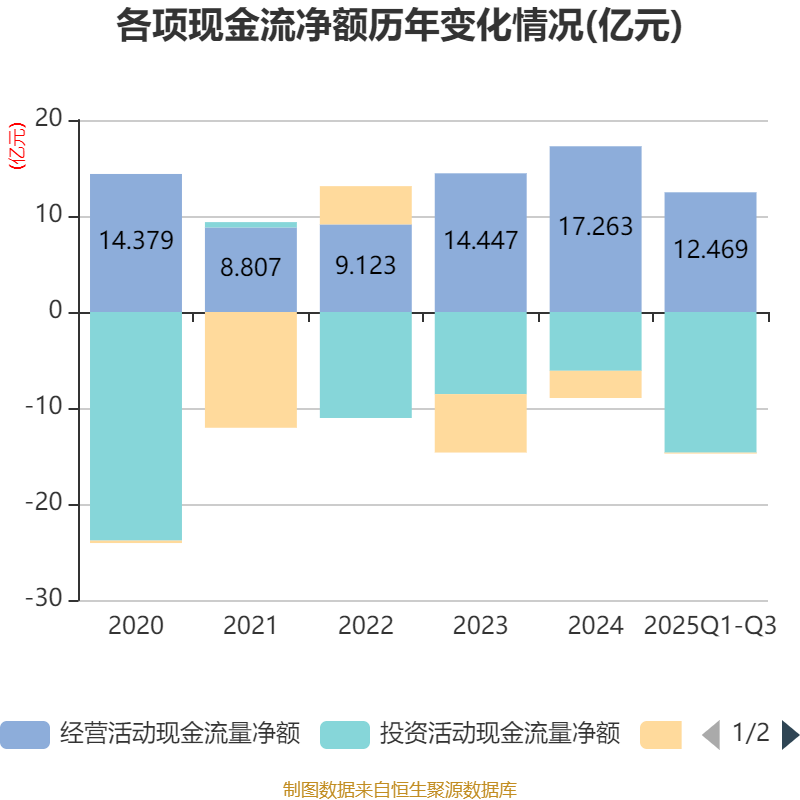 2025年前三季度,公司经营活动现金流净额为12.47亿元,同比增长0.32%;筹资活动现金流净额-1013万元,同比减少5571.5万元;投资活动现金流净额-14.65亿元,上年同期为-8.5亿元。