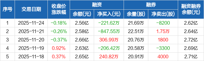 融资方面,当日融资买入1112.67万元,融资偿还1334.29万元,融资净偿还221.62万元。融券方面,融券卖出1.23万股,融券偿还2.05万股,融券余量21.69万股,融券余额589.45万元。融资融券余额合计2.62亿元。