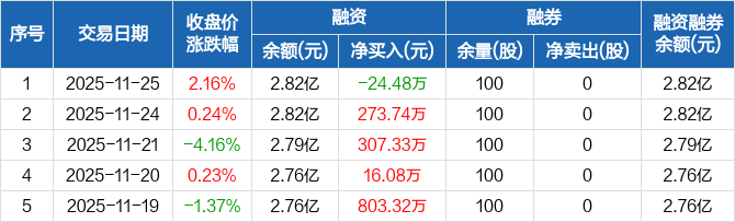 融资方面,当日融资买入693.67万元,融资偿还718.15万元,融资净偿还24.48万元。融券方面,融券卖出0股,融券偿还0股,融券余量100股,融券余额425元。融资融券余额合计2.82亿元。