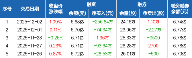 融资方面,当日融资买入1170.53万元,融资偿还1427.37万元,融资净偿还256.84万元。融券方面,融券卖出1.32万股,融券偿还2200股,融券余量24.16万股,融券余额648.45万元。融资融券余额合计6.74亿元。