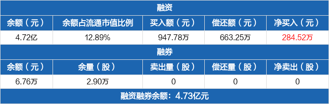 融资方面,当日融资买入947.78万元,融资偿还663.25万元,融资净买入284.52万元,连续4日净买入累计1928.38万元。融券方面,融券卖出0股,融券偿还0股,融券余量2.9万股,融券余额6.76万元。融资融券余额合计4.73亿元。
