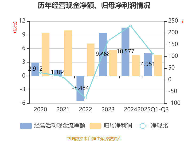 2025年前三季度,公司经营活动现金流净额为4.95亿元,同比增长4.61%;筹资活动现金流净额-8.7亿元,同比减少1.89亿元;投资活动现金流净额1.93亿元,上年同期为-7678.66万元。