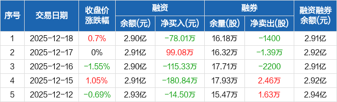 融资方面,当日融资买入383.65万元,融资偿还461.66万元,融资净偿还78.01万元。融券方面,融券卖出100股,融券偿还1500股,融券余量16.18万股,融券余额92.87万元。融资融券余额合计2.91亿元。