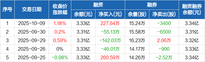 融资方面,当日融资买入1218.35万元,融资偿还990.72万元,融资净买入227.64万元。融券方面,融券卖出400股,融券偿还3800股,融券余量15.24万股,融券余额78.64万元。融资融券余额合计3.34亿元。