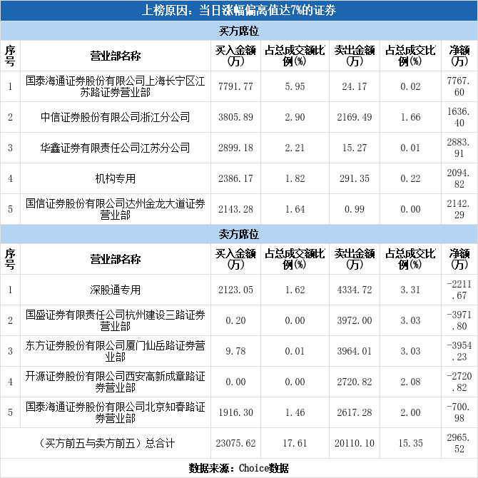 龙虎榜数据显示,今日买四为机构席位,该席位净买入2094.82万元,占龙虎榜净买额的70.64%。