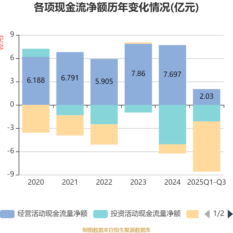 2025年前三季度,公司经营活动现金流净额为2.03亿元,同比增长172.24%;筹资活动现金流净额-6.46亿元,同比减少6.72亿元;投资活动现金流净额-2.14亿元,上年同期为-5.1亿元。