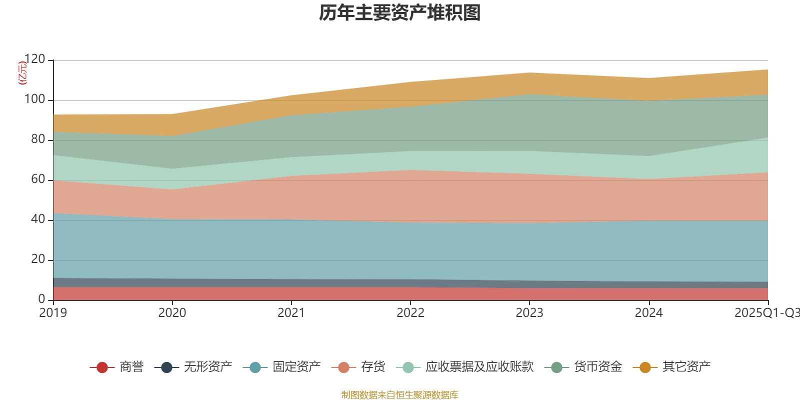 资产重大变化方面,截至2025年三季度末,公司货币资金较上年末减少22.08%,占公司总资产比重下降6.21个百分点;应收票据及应收账款较上年末增加50.81%,占公司总资产比重上升4.69个百分点;存货较上年末增加15.96%,占公司总资产比重上升2.19个百分点;应收款项融资较上年末增加93.96%,占公司总资产比重上升1.55个百分点。